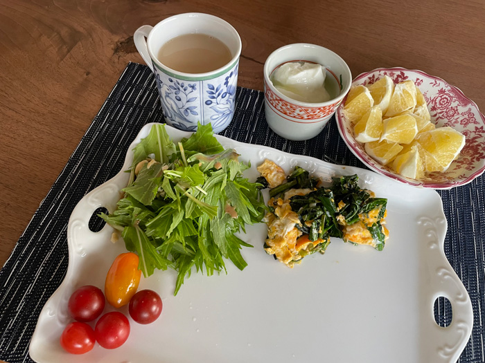 今朝の卵とじは、スイスチャードの葉の部分で。カラフルな方は別のおかずに使ったので緑色です。水菜のサラダも茎は加熱して使い、葉っぱのほうだけで。
