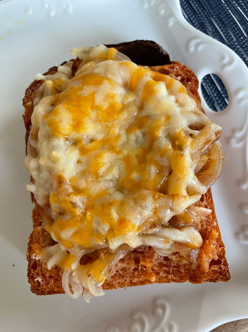 ハムは小さく全然見えません。玉ねぎは薄切りにしてチンしてちょっとの麺つゆを絡め、自家製のトマトブレッドの上に盛り、チーズをたっぷり乗せてからトーストです。トマトブレッドはトマトソースをパンに塗らなくていい便利なパンです。