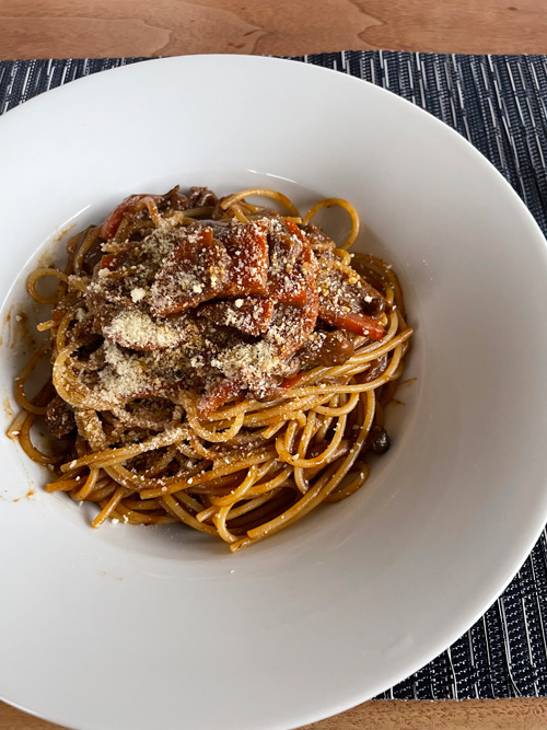 昨夜はハッシュドビーフだったので、その残りを使ってパスタにしました。ただただそれだけ。平日のお昼ご飯はとにかく超簡単にするに越したことは無いので、こういうリメイクできるものがあるとありがたいです。