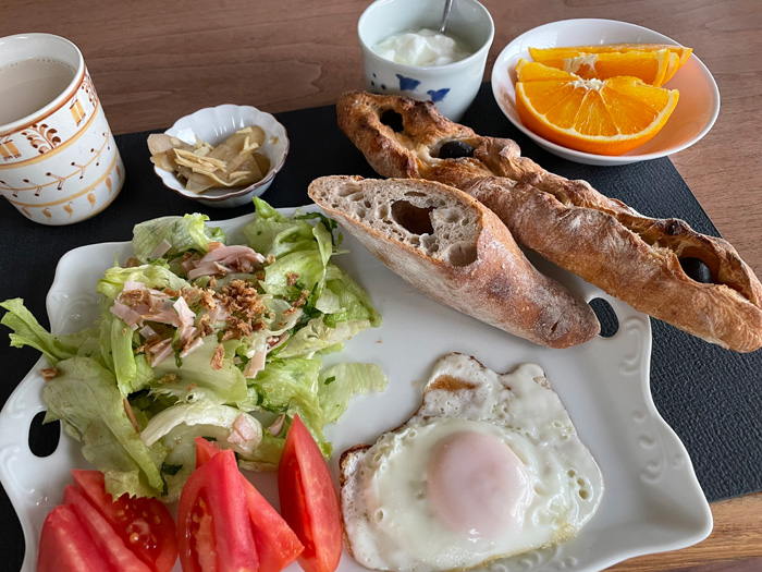 MATINのパンで。オリーブのパンは半分ずつシェアです。リベイクすると小麦の香りがさらにとてもよくなり、朝から幸せな気持ちになれます。