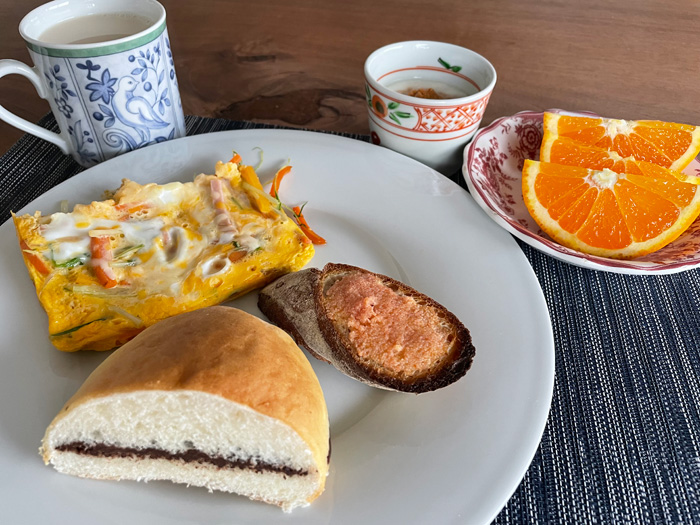 野菜やハムは全部刻んで卵で閉じると、きゅっと収まってしまいます。もう少し生野菜を添えればよかったかな。