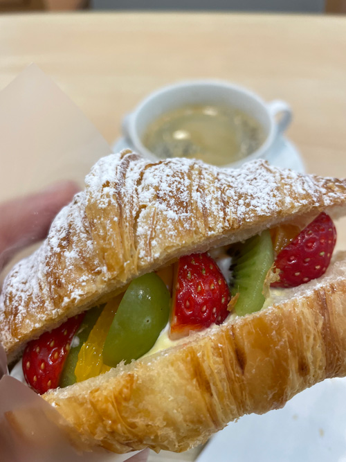 とある懸賞でこちらの焼き菓子セットが当選したので、受領がてらずっと再訪して食べたかったスイーツクロワッサンをいただきました。前回は粒あん&生クリームだったので、今日はフルーツ&生クリーム560円です。コーヒー360円も一緒に。ちなみにセット価格になるのは食事のサンドウィッチのみで、スイーツは別々に頼むことになります。