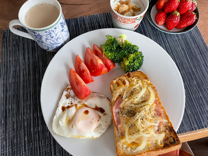 ブーランジェリーカワのパンでピザトースト的にしようと思って準備していたのですが、あまりに今朝は野菜が少ないことに気づきました。週末近くなり野菜の在庫もなく、玉ねぎならあった…!ということで急いでスライスしてチンして上にたっぷり乗せました。まだまだ不足だろうけどないよりはいいかなと。