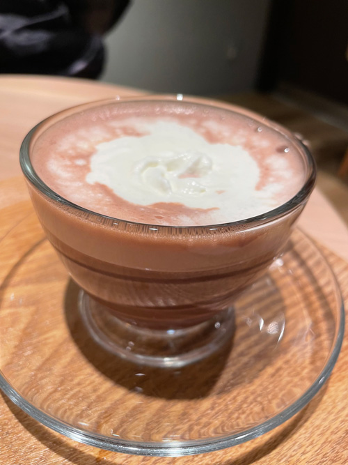 夜ウォーキング途中にカフェに立ち寄りたいと夫がしばしば提案するので、そういう気分の時は従うことにしています。少し遅めだと眠くなるし、さっさと歩いて帰ってお風呂に入って寝たいときには帰りますけど。で、色んなカフェではなんとなくココア的なものを頼むようになりました。