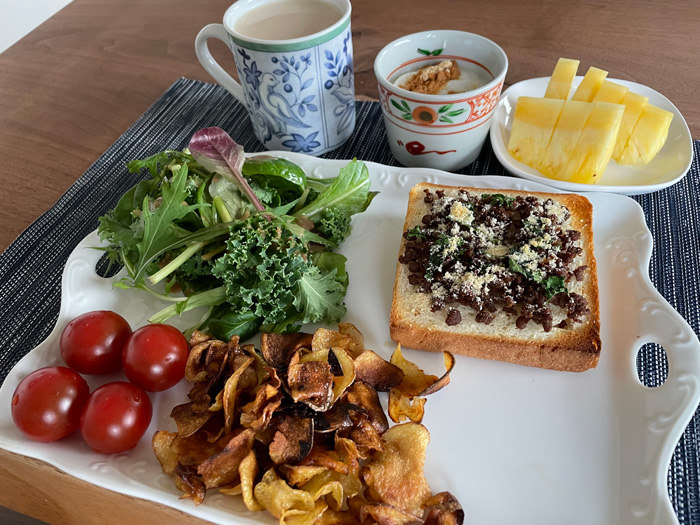 手前のどっさりとしたポテトチップスは、スーパーで買ったインカのめざめのチップス。甘さが凄かったです。全体的にボリュームがあったので、卵料理は割愛。今シーズン初の台湾産パイナップル、今年も会えて嬉しいです。