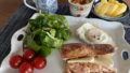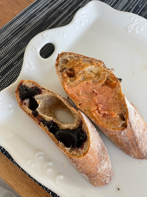 1切れは明太マヨネーズ、もう1切れは桑の実ジャムと、2種類用意しました。