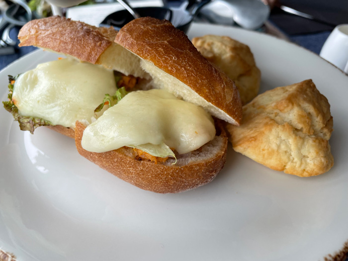 スコーンやほぐしたロティサリーチキンのサンドイッチ。