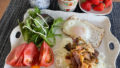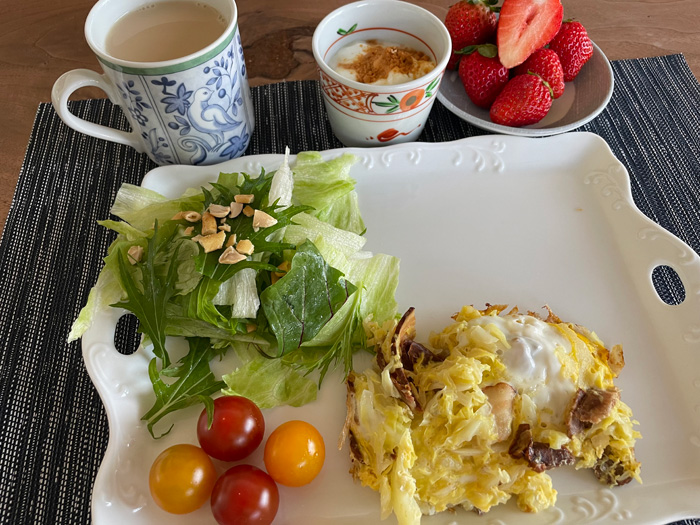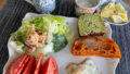 まずはおかずの部。サラダのトッピングは、柿の種オリジナルスパイスで結構ガーリックが効いたものを使いました。夫がツマミ用にCHUMSコラボで期間限定商品のもので、結構風味が強かったのでトッピングにもぴったりでした。
