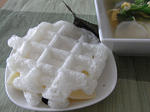 モッフルの内側に少し醤油を塗り、チーズをはさみ、更に海苔で挟んで出来上がり。