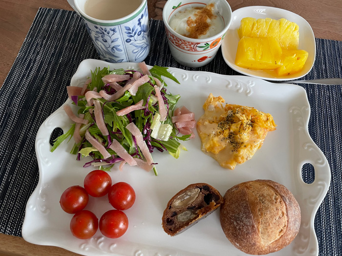 引き続き札幌で買ってきたブーランジェリーコロンのパンで朝ごはん。丸い方はパン・コンプレ。みっしり噛みしめて旨味が出てくる美味しいパンです。スライスしているのはベリーと白花豆のシュトレン。Mottainaiセットのものです。