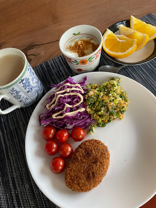 前日夫がお土産に買ってきてくれたコロッケ、タイミング的に私は食べられなかったので今朝に繰り越しました。朝から贅沢。カブの葉を卵で炒めたり、紫キャベツを千切りにしたり。果物は、宇和ゴールドで後味すっきり。