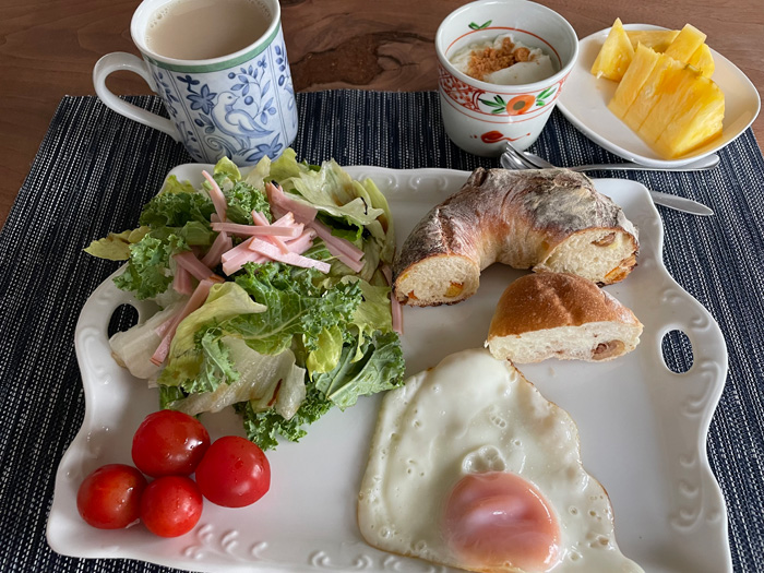 トラスパレンテのパンで 2023.06.23 今朝は、夫が買ってきてくれたトラスパレンテのパンで。バレンシアオレンジとヘーゼルナッツがぎっしり詰まっていて美味しかったです。明日は朝が早いので、とにかく何とかできるだけの洗濯をし、早く寝ることにしました。結果的にあまり寝られませんでしたが…。