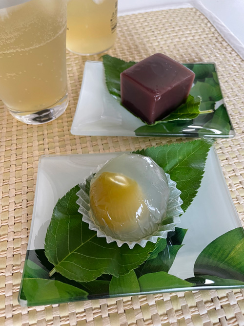 手前が私の梅の雫。青梅が入っていて好みの夏のお菓子です。