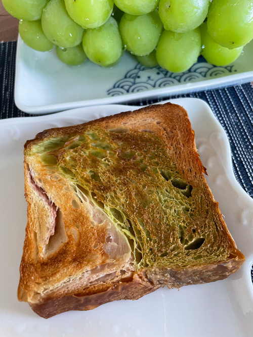 京都の三色をトーストで 2023.08.30 今朝はシャインマスカットの存在感が凄いので全体的に緑だな。グランマーブルの京都の三色を、解凍気味のひんやりした感じでよく食べていましたが、今朝はトーストにしました。 リッチなパンなのでバターなしでちょうどよい気がしました。
