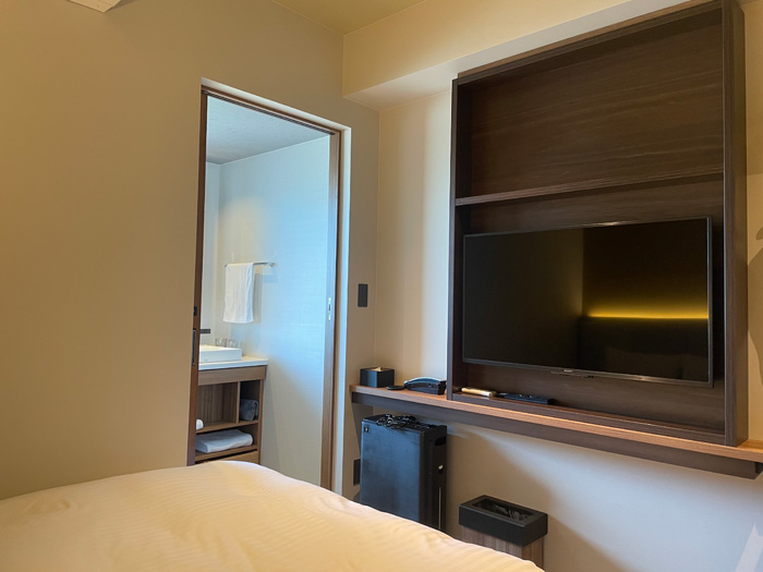 ベッドの足元付近の明るいドアを開くと、水回り。