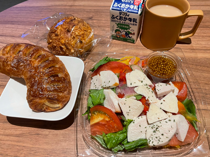 晩御飯は食べに行こうと色々考えていたのですが、めんべいのお店でめんべいカレーパンを買ってしまったので、それを食べる前提で色々と買い込みました。熊本県産和栗のデニッシュとか、以前も購入したMeat up!!のローストチキンサラダとか。観光キャンペーンのレジオンペイが使えるところは使いました。