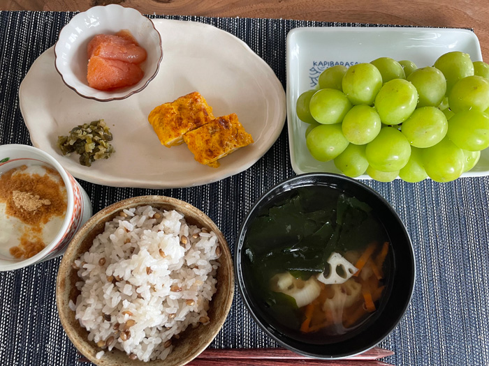 たまたま今朝は和食で。もち麦入り御飯とか野菜たっぷりの汁ものとか、辛子明太子、在所漬、卵焼き、きな粉入り自家製ヨーグルト。そしてシャインマスカット。