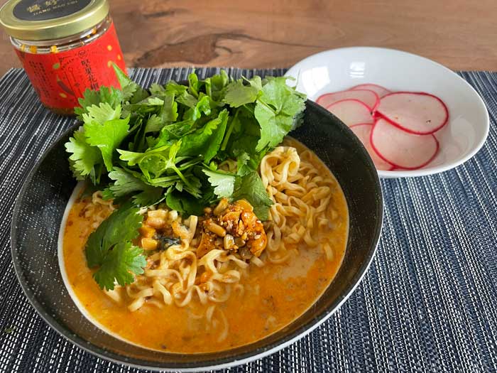 そして器に盛り、用意していたパクチーをトッピングしました。さらに夫がハマっている堅果花椒醤(ナッツホアジャオジャン)もちょっと乗せました。そもそもナッツざくざくのところでさらにナッツホアジャオを足すので相当ざくざくを楽しめました。