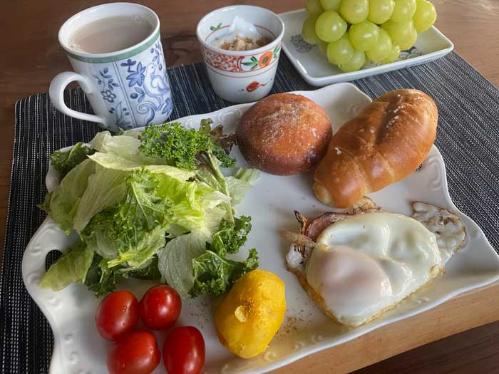 サラダのドレッシングは、最近ニンニク醤油を貰ったのでそれを使って夫に作ってもらっています。ゴマ油も入り、コクとパンチがあり、朝から元気になります。