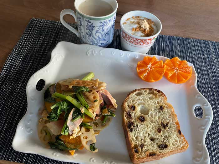ラムに浸したレーズンで焼いたパンでの朝ごはん。トーストしてこの後発酵バターも塗って香りも増して楽しめます。