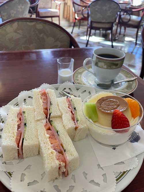レディースセット1,200円は、ハーフサイズのミックスサンドと選べるケーキを1つ、そして飲み物がセットになっています。ケーキはデラックスプリンにし、オリジナルブレンドコーヒーにしました。