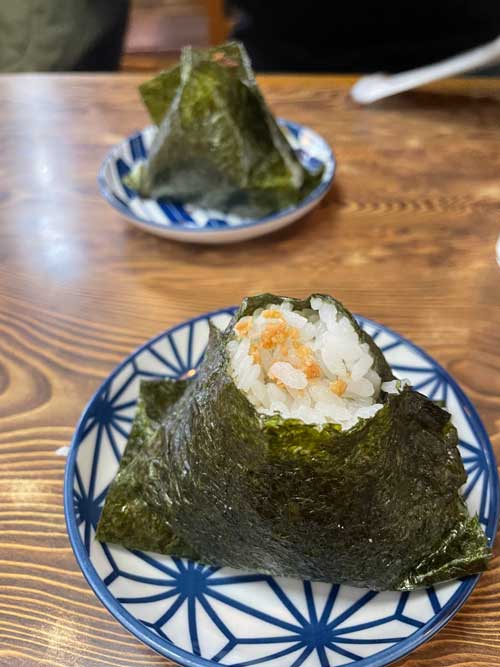夫は桜エビのかき揚げが乗ったてんぐそばなので、私は味見せず。もう一声欲しくなりそうと思い、めずらしくおにぎり200円も1つずつ頼みました。