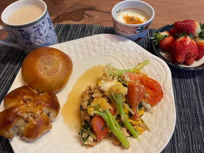 カリフローレとトマトと水菜の卵炒め、トマトの水分が出たのでパンが追いやられています。結局染みていきそうだったので、お皿を別にしました。
