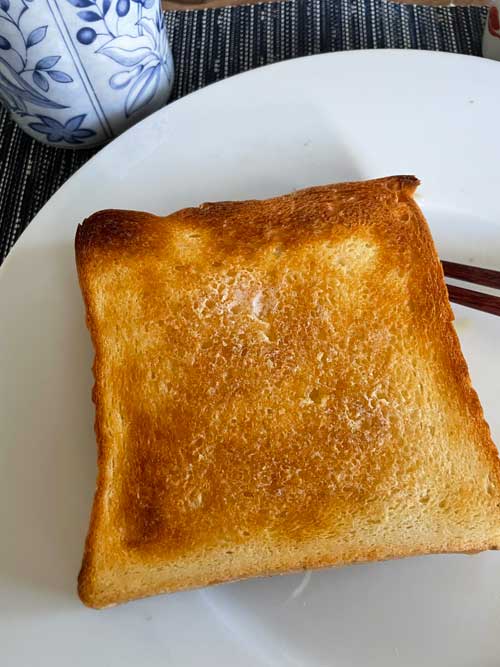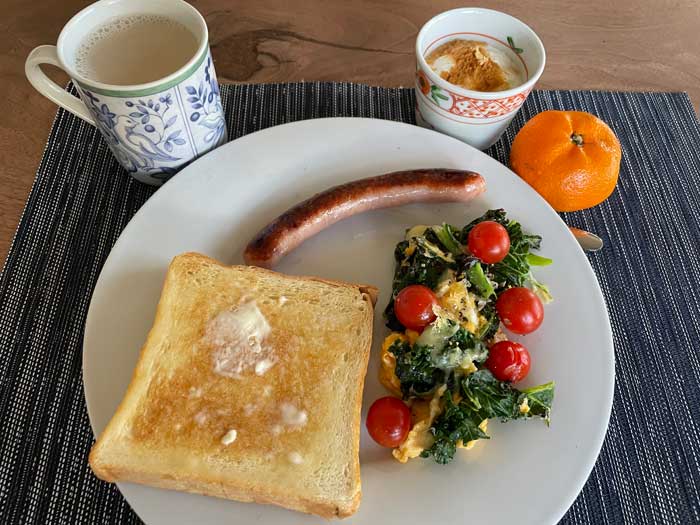 ケールとたまごとミニトマトのソテーが我ながら色鮮やかだなと嬉しくなります。バタートーストは、今朝のおかずが少なめだから一緒に出してもいいかなと思ってお皿に一度は乗せました。しかしやはりこの寒い時期、急速に冷えていくのでもう一度トーストしてこんがり熱々にしました。
