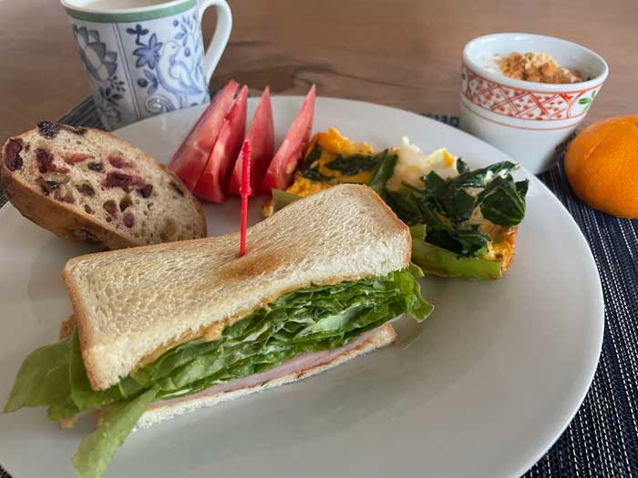 サンチュがまだたくさん在庫があったので、ホットサンドというよりはトーストサンドにしました。おやつパンにはクランベリーとチョコのパン。クランベリー多めの部分で甘酸っぱさが増した一切れでした。