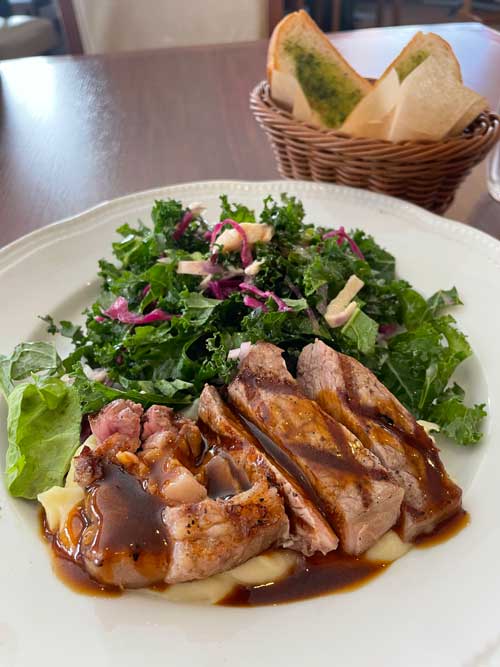 そして冒頭のステーキサラダとガーリックトーストが運ばれてきました。お肉は柔らかくて美味しかったです。ケールもたっぷりで嬉しい。