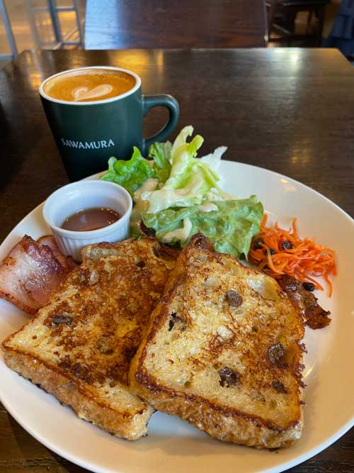 モーニングは広尾の沢村のイートインにて、フレンチトーストセット1,550円に+310円でカフェラテにしました。(税別)