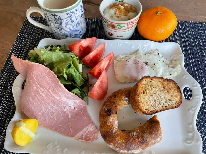 沢村のショコラ大納言などで朝ごはん。フランスパン生地に大納言小豆やチョコチップがぎっしり詰まっていて、満足感の高いパンでした。もう1つはパンコンプレ、トーストして香ばしさが増しました。