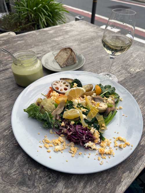サラダにはこのグループのお店で出てくるオリジナルの淡路新玉葱と有機大葉ドレッシングをたっぷりかけます。ぽってりしてお野菜によく絡みます。絶対サラダは食べたい。