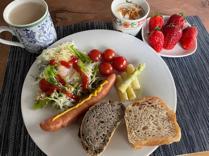 巣篭り卵には野菜色々。白いアスパラやいちごなど、春らしい朝ごはんでした。