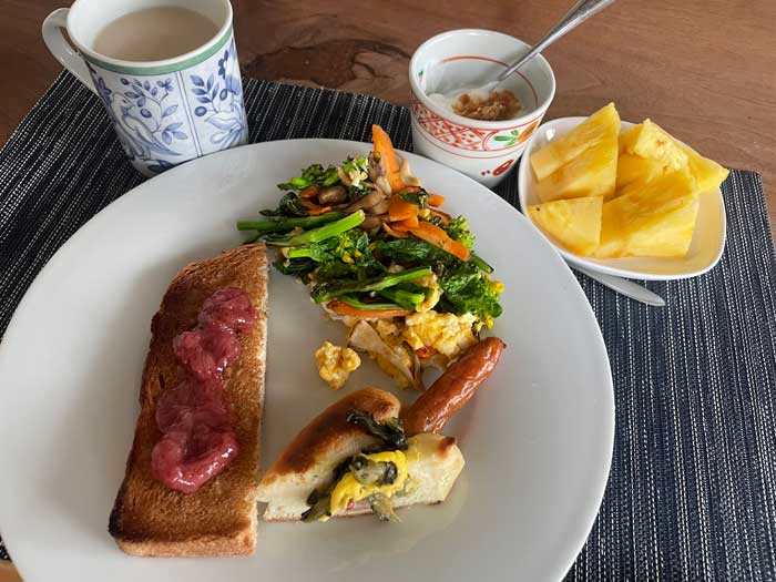 昨日食べ過ぎたので今朝は軽めにしております。野菜の炒め物は、うっかり花を開かせてしまった菜の花やニンジンの卵とじ。今年も普通に売られていて嬉しい台湾パイン。
