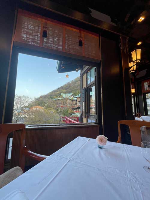 窓際で花御殿が向こうに見えます。明るいうちからのディナーなので景色も楽しめるのがよい。
