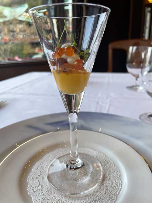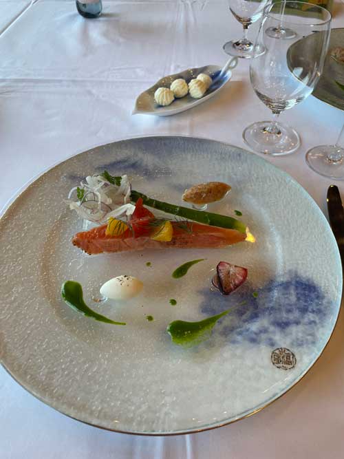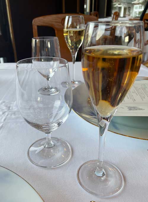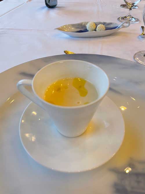夫はワインペアリング3種をオーダー。ノンアルコールもペアリングがありましたが、基本的に甘い感じの飲み物を食事の時に飲むのが苦手なので、最初の一杯だけパリ セズィエーム ブランというノンアルコール スパークリングを。