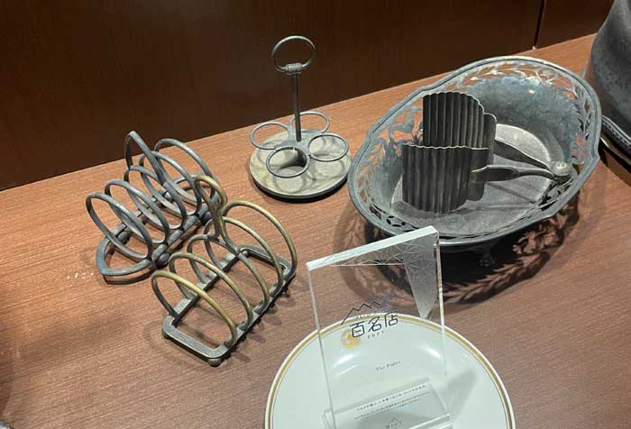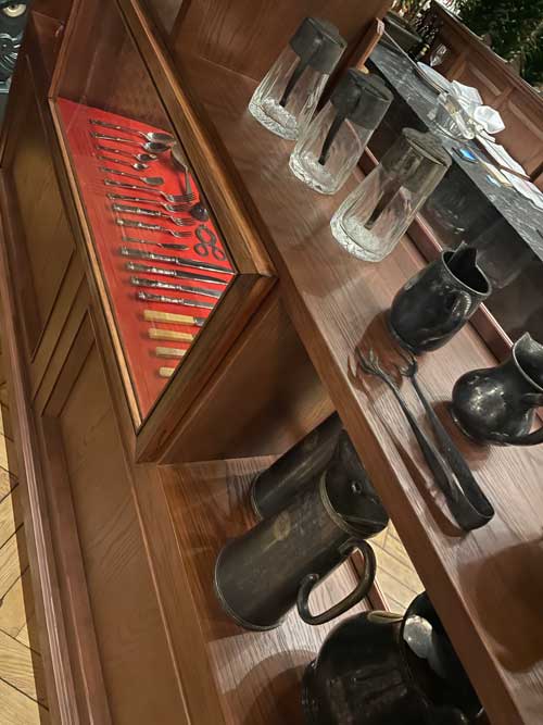 大満足でレストランを後にしますが、入ってくるときに気になっていたかつてのカトラリーや食器などの展示をこのタイミングでじっくりと拝見。