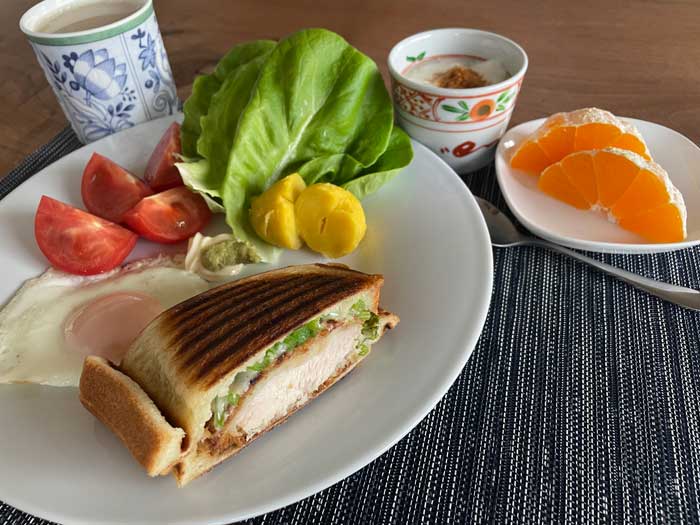お惣菜屋さんで買うチキンカツはほぼホットサンド目的で冷凍しています。その時の色々と一緒にサンドして、カリカリに焼き上げられたら、朝から幸せな気持ちになれます。