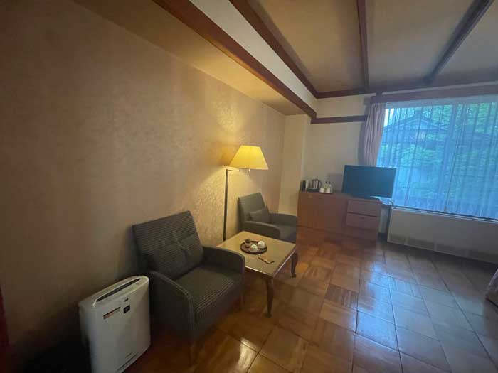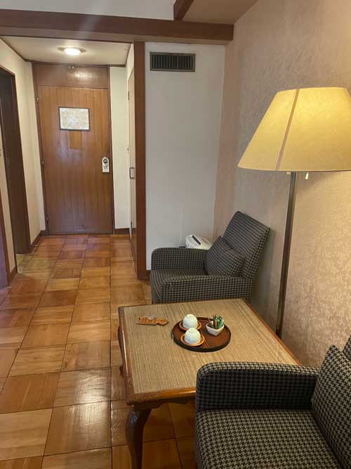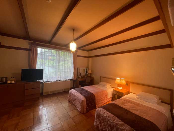 ツインルーム。1961年建設の第二新館は、東京オリンピックでたくさん来るであろう外国のお客さんを見込んで新しく作られたとのことでした。