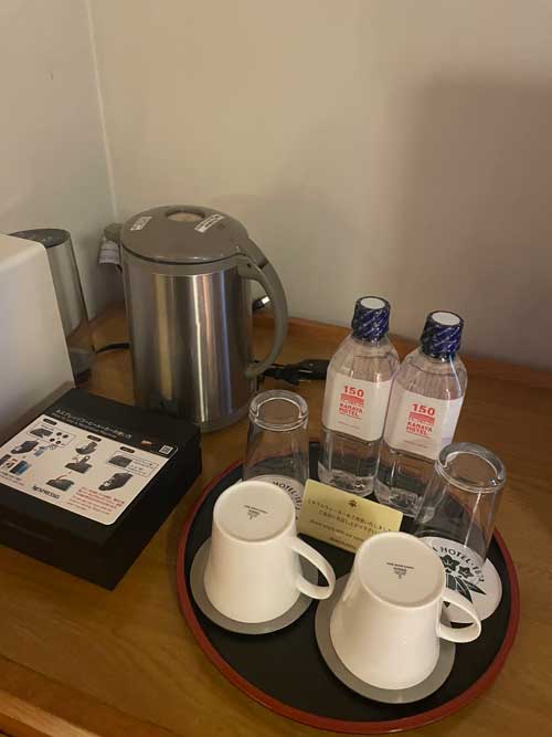 備え付けのポットなど。お水は150周年記念パッケージ。歴史を感じます。
