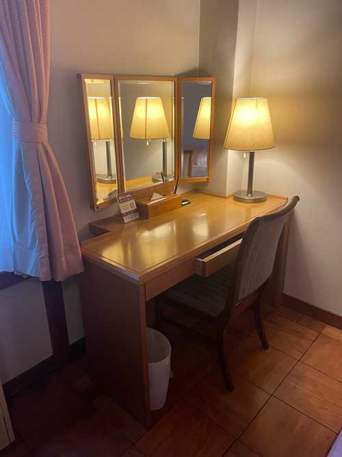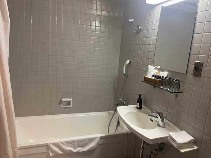 バスルーム。最初に予約した時にはスタンダードクラスで残っていたのはシャワーのみのお部屋だったのですが、その後何かのタイミングでバスタブ付きの部屋スタンダードAの空きを見つけて予約を取りなおしました。