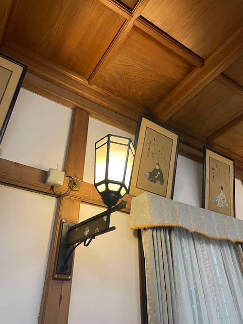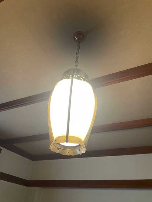 灯りのデザインもまたこの部屋のオリジナルで、見るところあれこれと飽きが来ません。この部屋では昨夜ウェディングが行われたそうですが、昔々は社員の盛大な慰労会なども催されていたそうです。