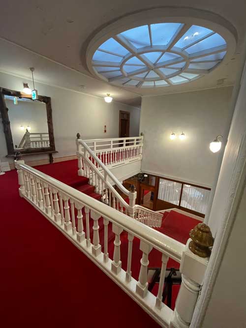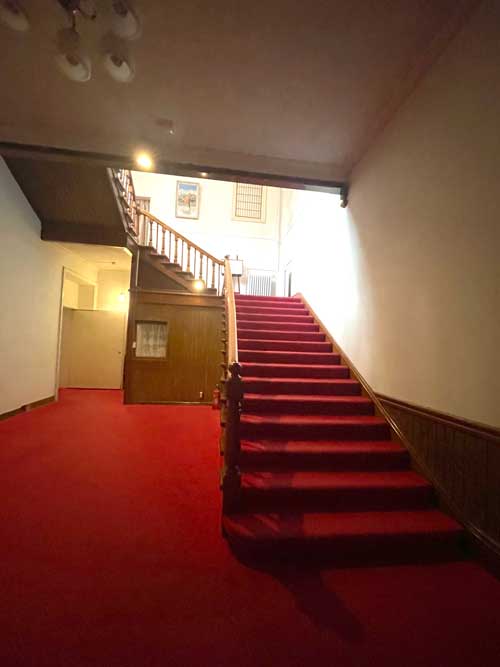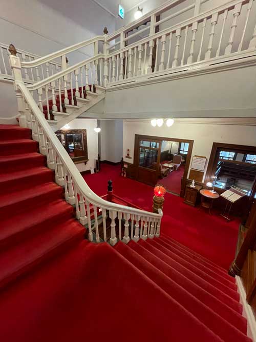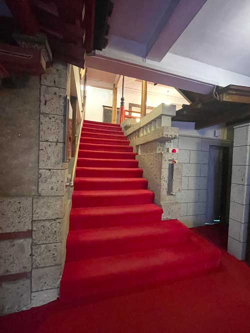 小食堂横の廊下には、金谷ホテルの歴史の写真や資料が飾られています。一部説明がありましたが、翌日改めてじっくりと拝見しました。その先にはバンケットホールがあります。その前の階段。