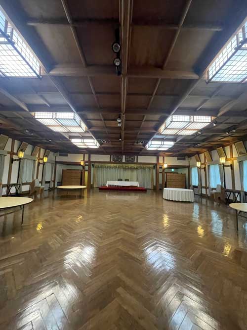 バンケットホールの中。ヘリンボーンの床も美しい。