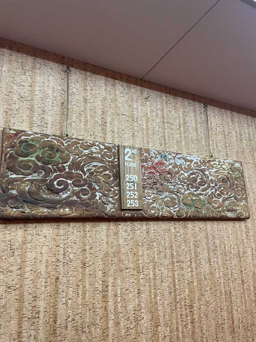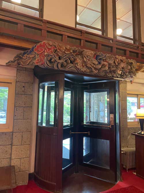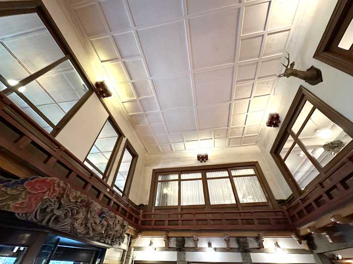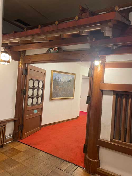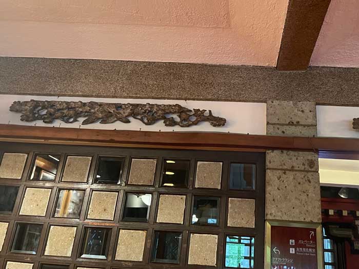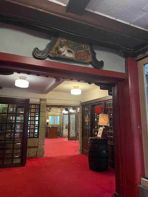 フロントから奥に入っていく廊下の上にも眠り猫がいます。この写真の右奥にはバーがあり、営業時間前だったので中にも入らせていただきました。暖炉の話や真空管アンプがあることなども説明がありました。