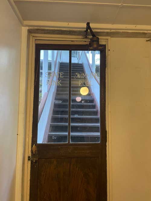 このすぐ右側は会議室となっていました。木に墨で「会議室」と書かれた札が掛かっていました。さらに進むとスケートリンクとプールへの入り口です。自力ではこの通路が分からなかったので、ガイドしてくださったスタッフの方にあらかじめお尋ねしていました。