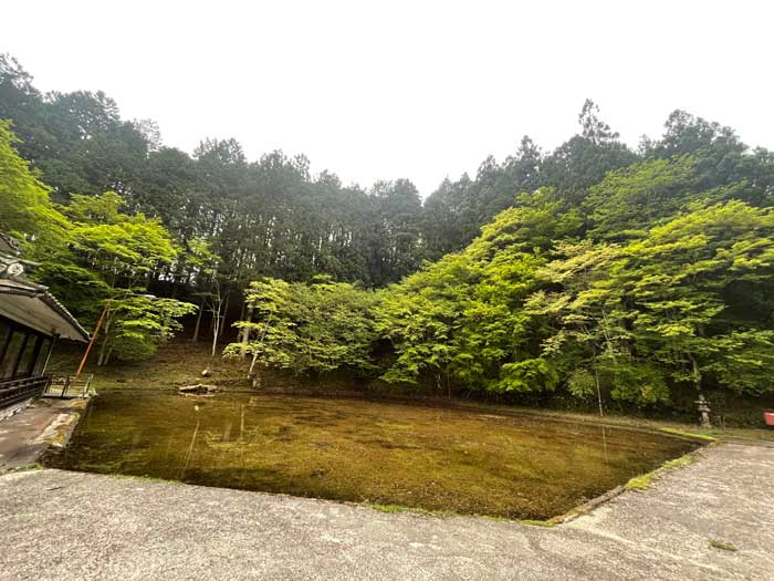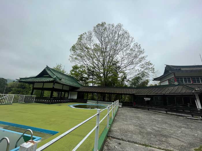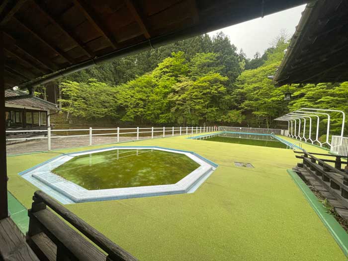 プールとスケートリンクへ辿り着きました。どちらにしてもオフシーズンなので、全体的に水には藻とかオタマジャクシとかのパラダイスになっています。
