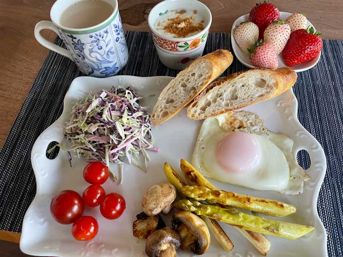 今朝はベーカリーモグモグのバゲットを添えた朝ごはん。バゲットはこの後こんがりトーストしてバターを塗りました。
