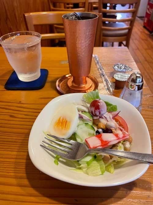 彩りよく色々入っているのが嬉しいです。思わぬカニカマも入っていました。コーヒーは暑かったのでアイスにしました。